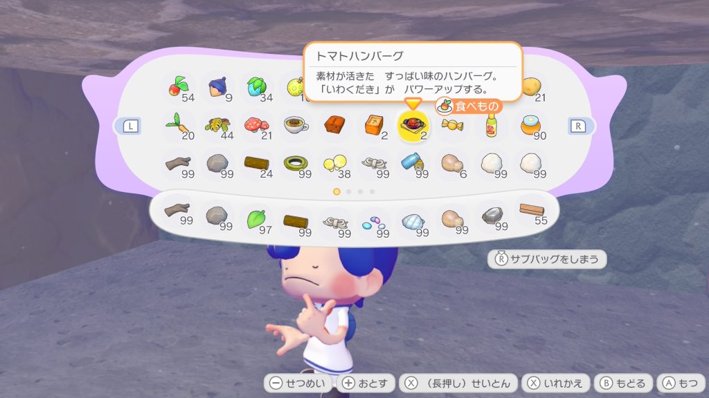 まず地下への道と地下空間を作ります。今回は下に5マス、横に5マス掘った先に7マス×10マスの地下空間を作りました。地下に行けば行くほど固い岩を掘ることになるので「いわくだき」をパワーアップする「ハンバーグ」を作っておきましょう。そして、メタモンのへんしん能力「でんじふゆう」を覚えていない方はバッグに「はしご」を入れておくのもお忘れなく。
